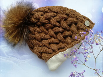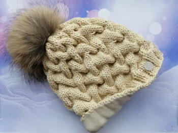 Roku darbs. Adīta cepure ar dabīgo bumbuli.