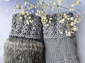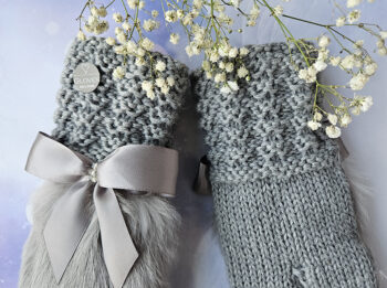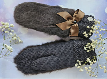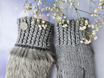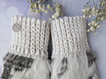 Roku darbs, adīti dūraiņi ar truša kažokādu.