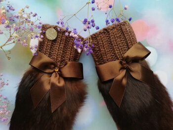 Roku darbs, adīti dūraiņi ar truša kažokādu.