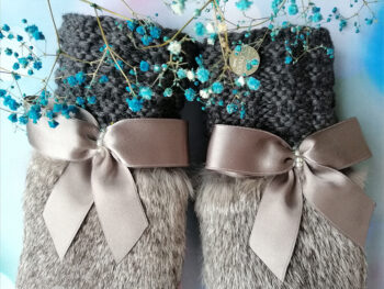 Roku darbs, adīti dūraiņi ar truša kažokādu un flīsa oderīti. Iesaiņots kā dāvana un gatavs uz vietas.