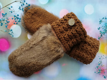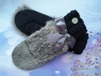 Roku darbs, adīti dūraiņi ar truša kažokādu un ar iestrādātu flīsa oderi.