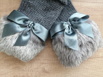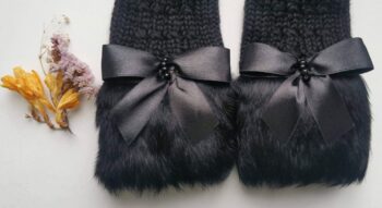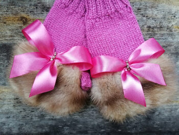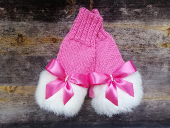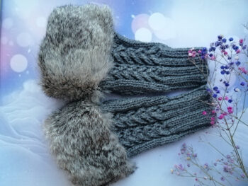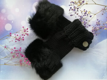 Roku darbs, adīti puscimdi ar atvērtu pirkstu daļu un truša kažokādu.