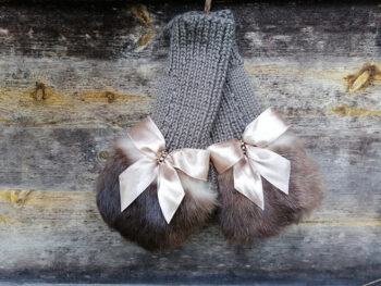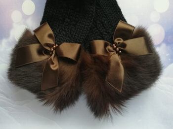Roku darbs, adīti puscimdi ar atvērtu pirkstu daļu un ūdeļādas kažokādu.