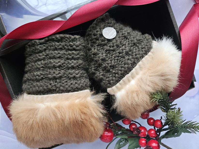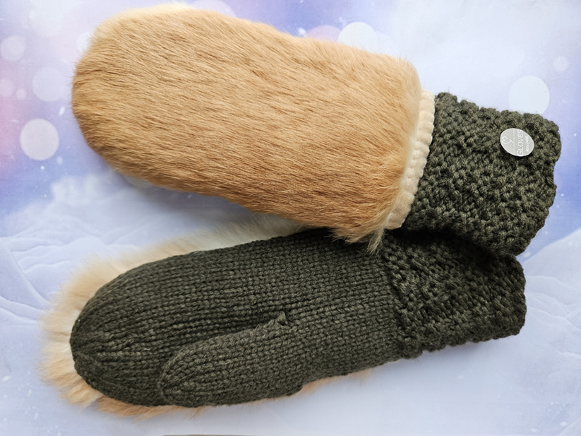 Roku darbs, adīti dūraiņi ar truša kažokādu un flīsa oderīti. Iesaiņots kā dāvana un gatavs uz vietas.