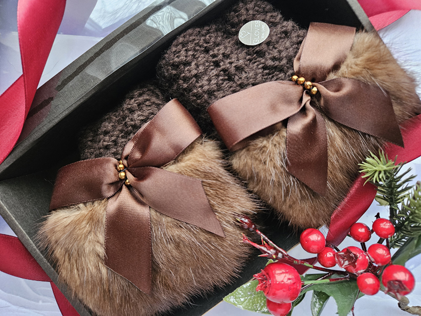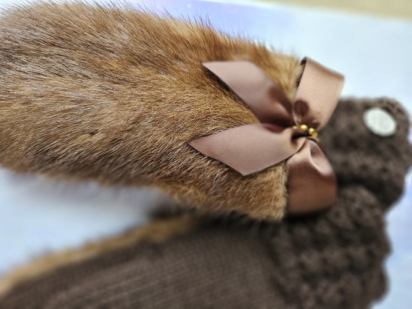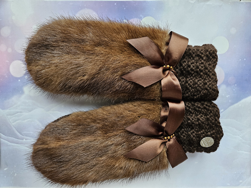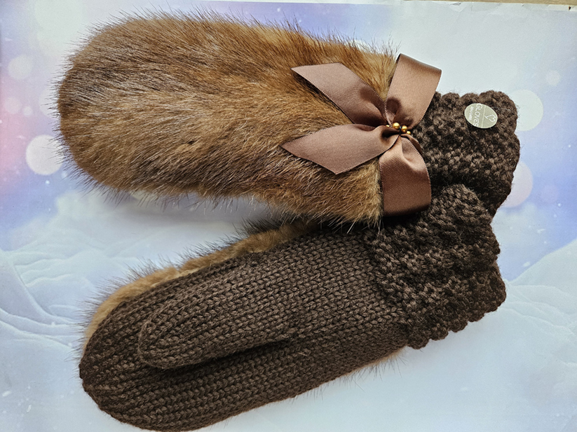 Roku darbs, adīti dūraiņi ar ūdeļādas kažokādu un flīsa oderi. Unikāla kažokādas krāsa.