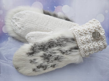 Roku darbs, adīti dūraiņi ar truša kažokādu.