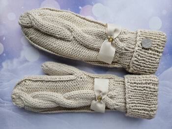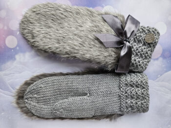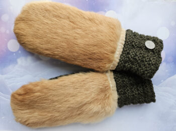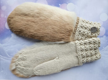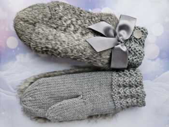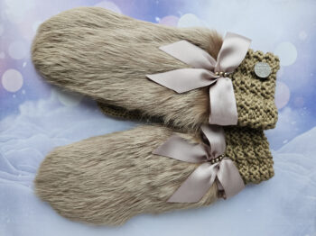 Roku darbs, adīti dūraiņi ar truša kažokādu un flīsa oderīti. Iesaiņots kā dāvana un gatavs uz vietas.