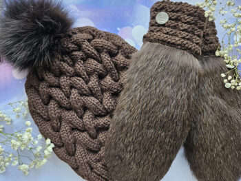 Roku darbs. Adīts komplekts ar truša kažokādu.